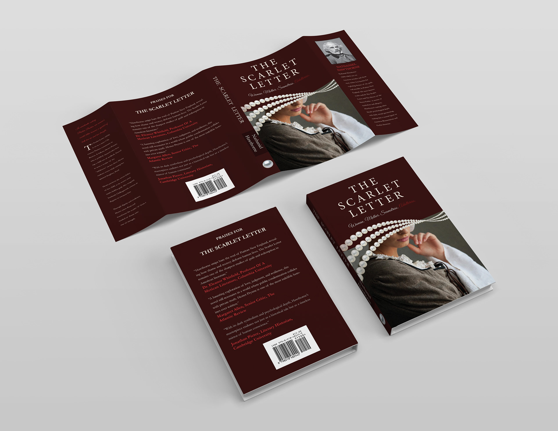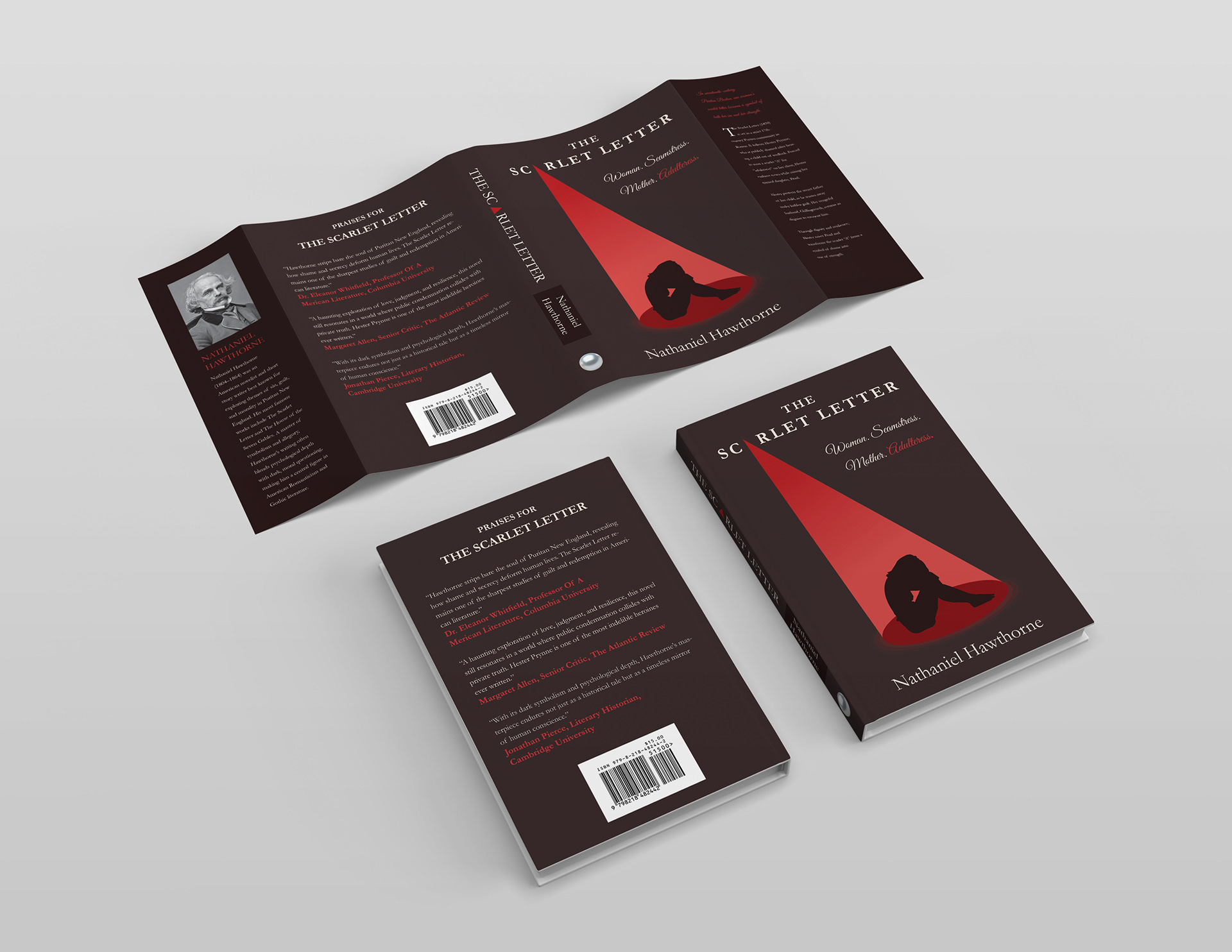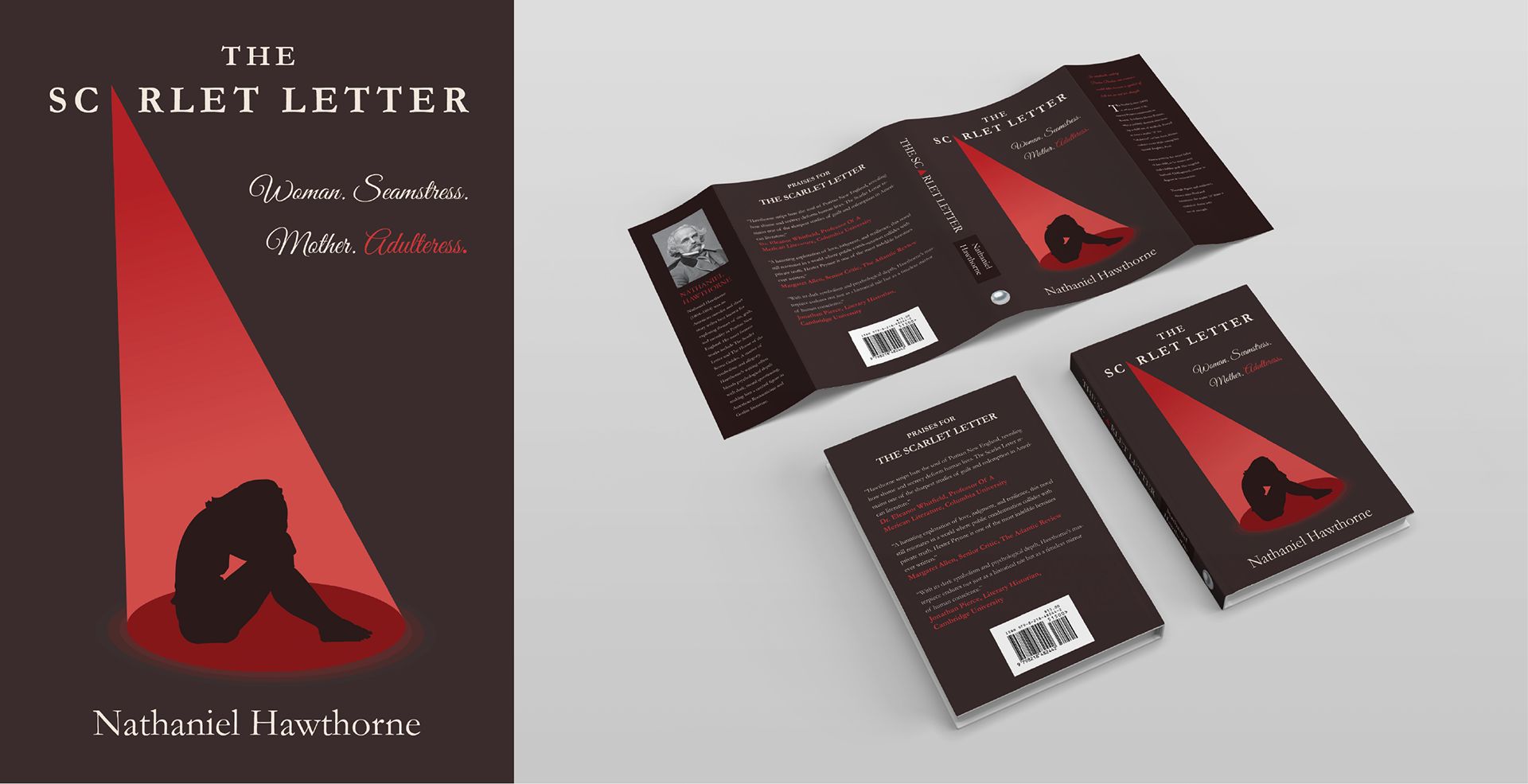 In the end, there were two designs that went into a mockup. They both show symbolism of modern themes in the book like shame and guilt, but in the end, I felt that the left design was the strongest. The left design takes the Puritan time period and brings a modern, yet relatable to this generation. The minimal silhouette and bold beam of red light simplify the story’s emotional weight into a single, striking moment. It hints at exposure, isolation, and internal conflict, but leaves enough room for interpretation.