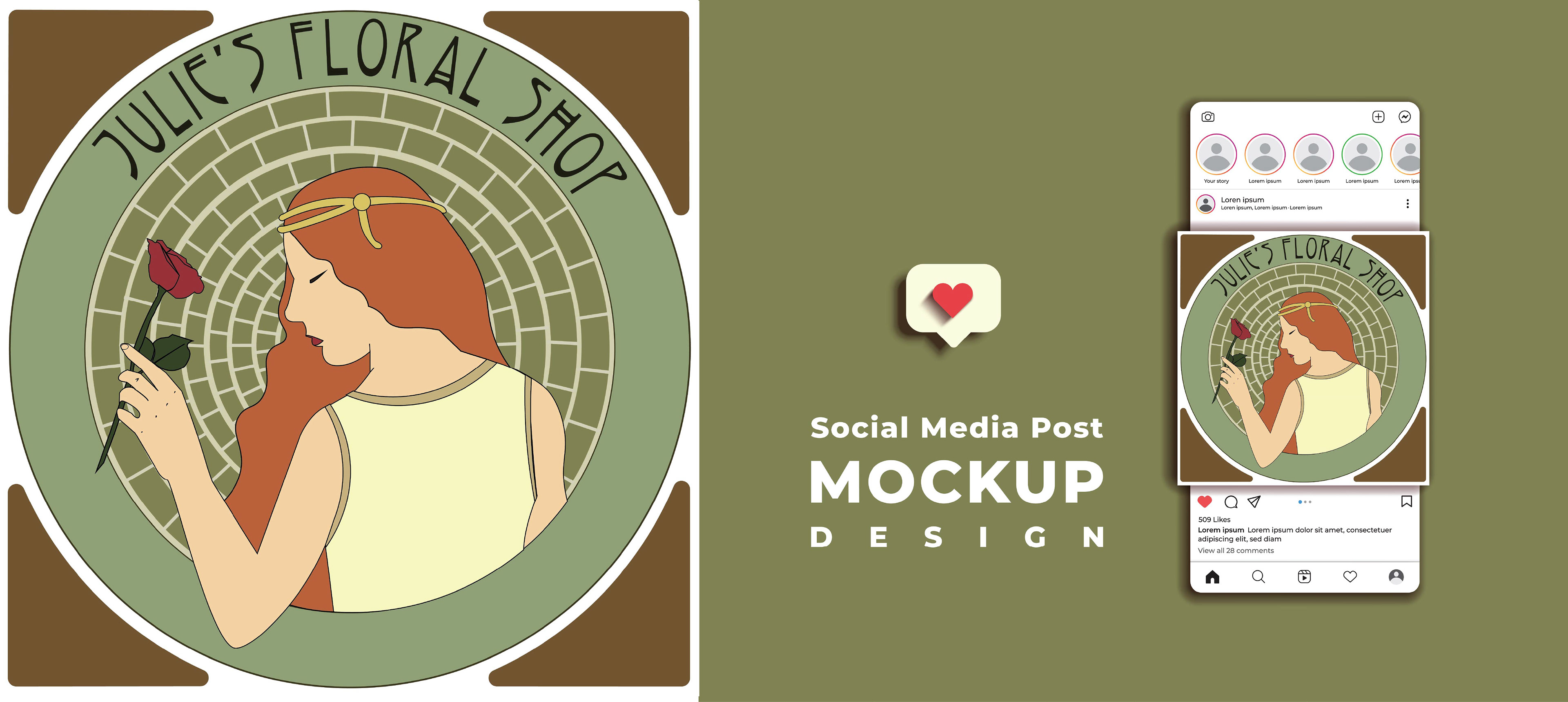 I aimed to create the iconic red-haired girl with the halo holding a rose. The girl is simple in design, while the green bricks are very detailed, which creates something balanced and pleasing to the eyes. I also incorporated a common photography composition of having the dominant eye in the center of the image. It draws your eyes toward the focal point of the design while also creating a sense of harmony, peace, and balance. I blended the delicate lines, floral elements, and natural motifs of Art Nouveau with the beauty of a floral shop. I wanted to create an elegant and timeless brand that feels modern and classical.